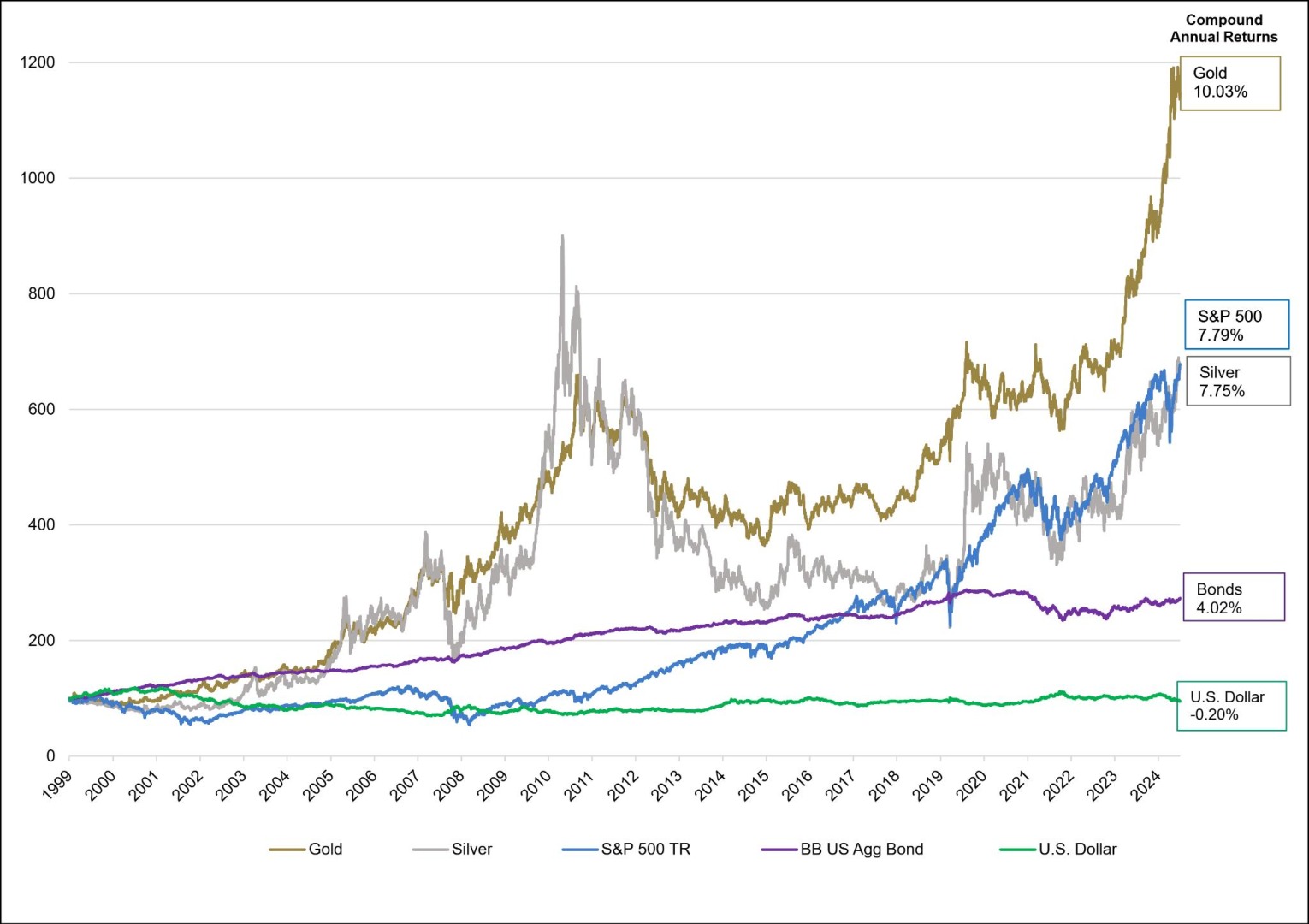 Hình 2 – Vàng và Bạc tăng trưởng vượt trội so với các loại tài sản khác (1995–2025)
