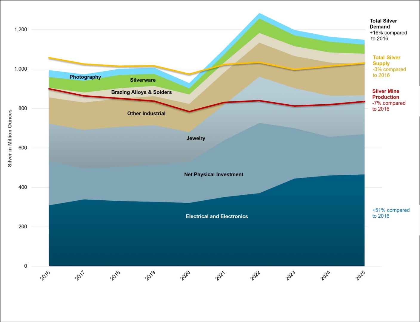 Bạc đã trong tình trạng thâm hụt cấu trúc từ năm 2021. Tổng thiếu hụt giai đoạn 2021–2025 gần 800 triệu ounce (25.000 tấn). Ngành điện và điện tử là động lực chính của nhu cầu bạc, tăng 51% kể từ 2016.
