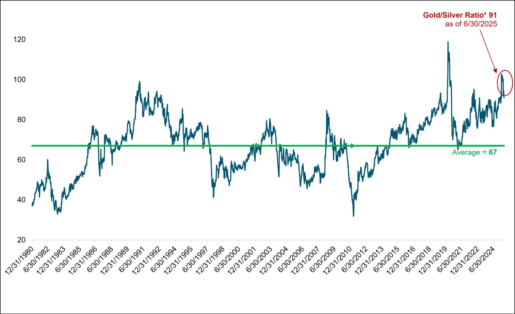 Hình 4 – Biểu đồ giá Vàng: Bạc - Bạc có thể đang bị định giá thấp so với vàng (1980–2025)